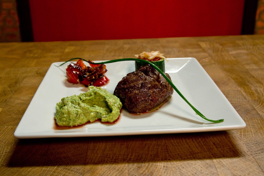 A. W. Yrjänä tarjoilee karitsan kera hauskan kasviskimaran: avokadopyreetä, serranokinkun kanssa muhennettua paprikaa ja paahdettua kurkkua.