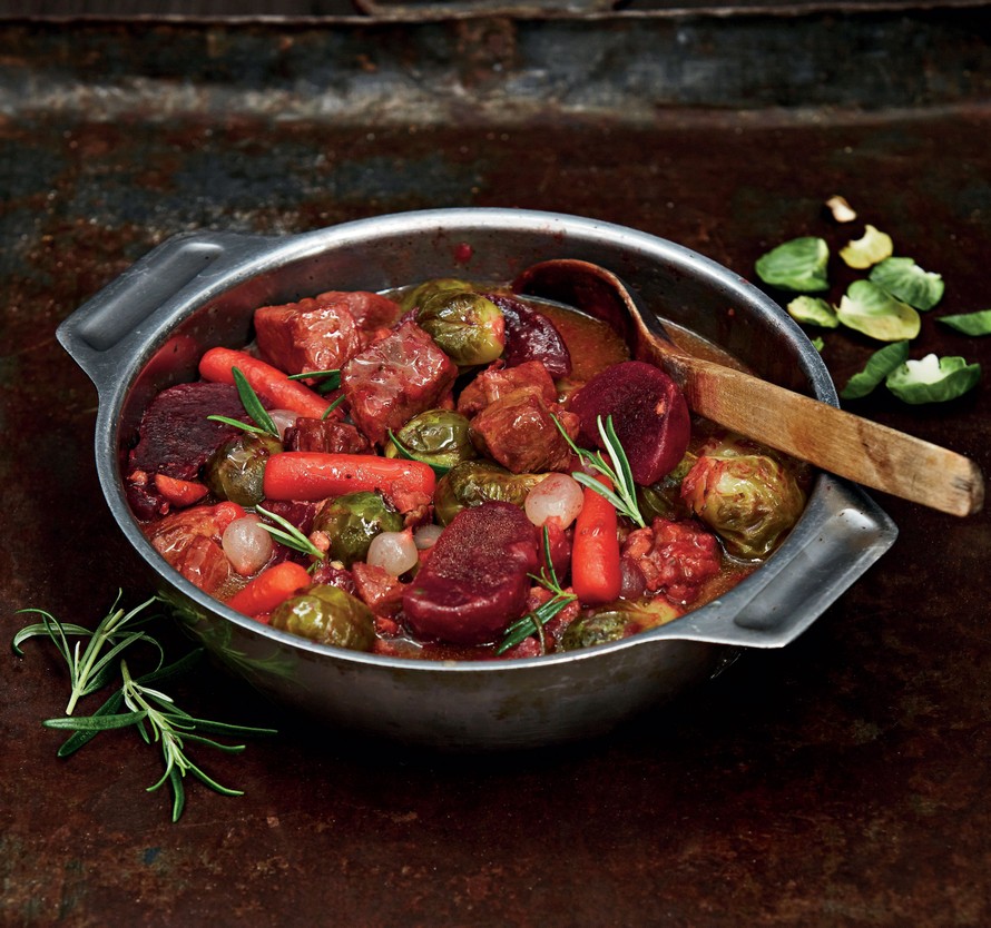 - Lisää pataan pakastepunajuuret, pikkuporkkanat ja kirsikkatomaatit. Kaada päälle vettä niin, että lihat lähes peittyvät. Lisää joukkoon hillosipulit, liemikuutio ja rosmariinin oksat. Hauduta lihapataa kannen alla miedolla lämmöllä 1½ tuntia. Sekoita välillä. Lisää pataan tarvittaessa vähän vettä.