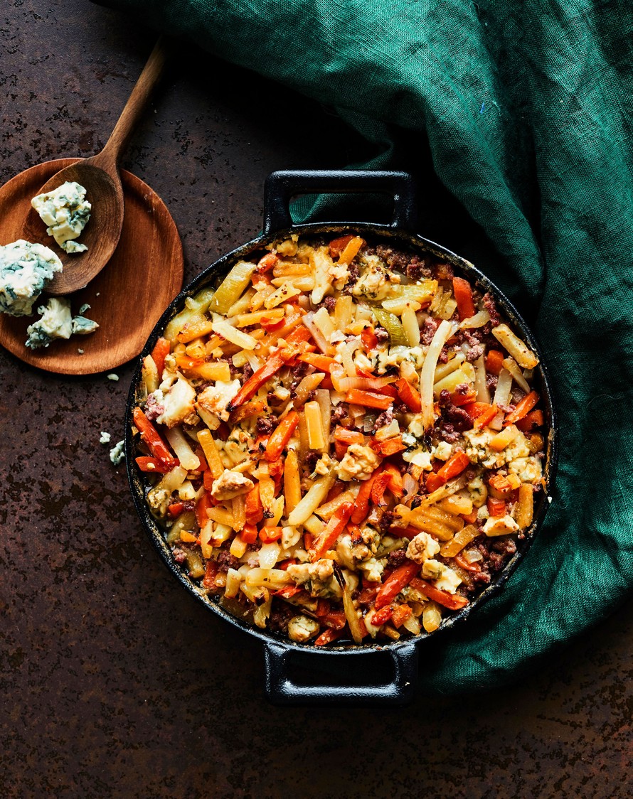 Älyttömän helppo kiusaus kypsyy uunissa pakastekasvissuikaleista. Pororouheen tilalle sopii myös kylmäsavulohi. Kevyeen lihaliemeen valmistetun kiusauksen täyteläinen maku tulee kourallisesta sinihomejuustoa.