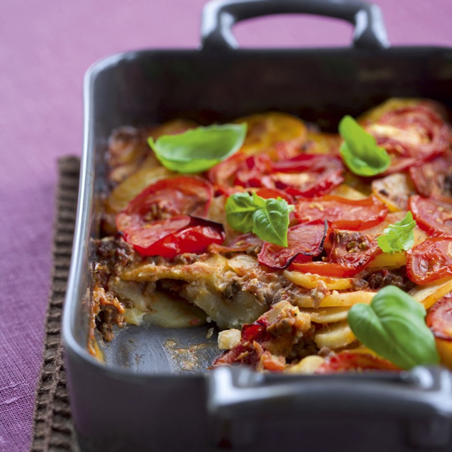 - Kuumenna uuni 225 asteeseen. Laita perunat ja jauheliha uunivuokaan, sekoita. Kaada joukkoon kerma. Viipaloi tomaatit ja lado ne päällimmäiseksi. Paista uunissa noin 45 minuuttia.