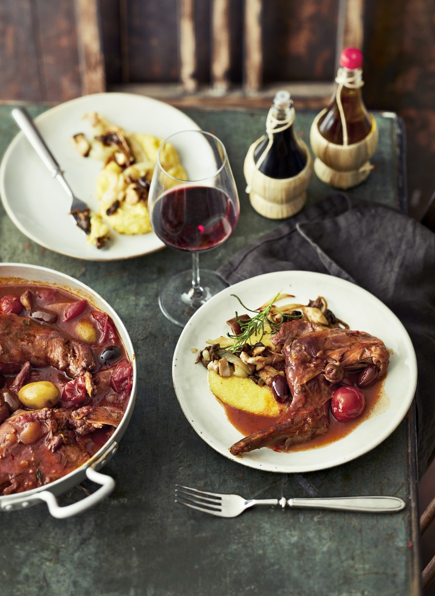 - Lisää kypsennyksen loppuvaiheessa oliivit. Jänis on kypsää, kun lihat irtoavat helposti luista. Mausta pippurilla ja lisää tarvittaessa suolaa.