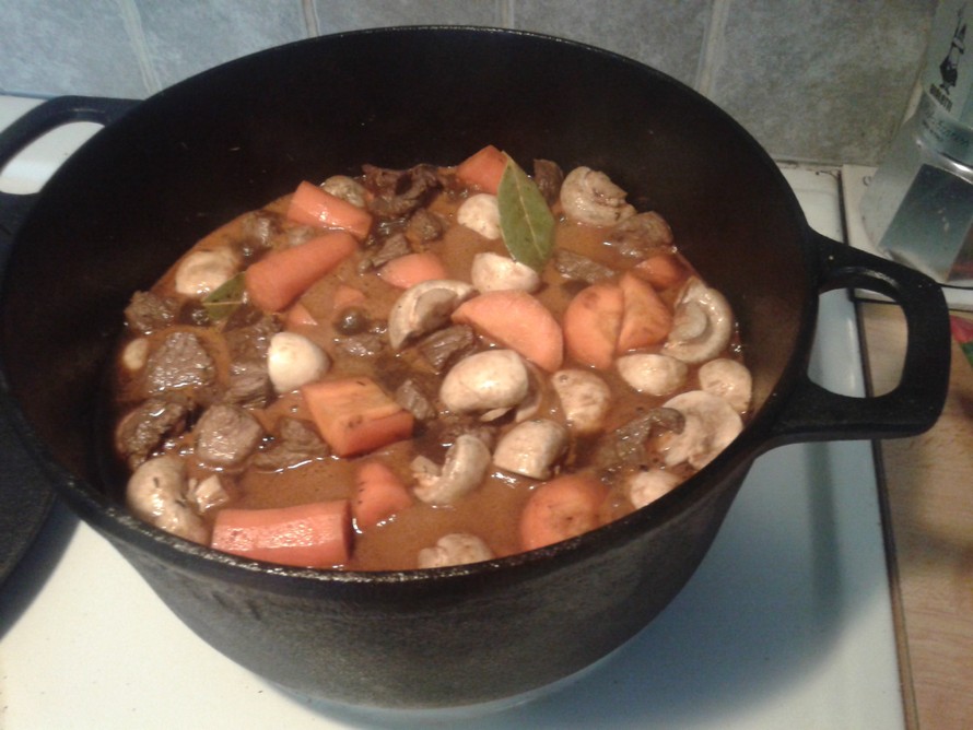 - Huoneenlämpöiset lihat paistetaan kuumassa valurautapadassa. Sekaan tomaattipyree, mausteet, yrtit, porkkanat isoina lohkoina, puolitetut sienet ja hillosipulit. Nesteet myös ja fondi. Kun kiehuu niin kansi päälle ja uuniin. 100-125 asteessa vähintään 3 tuntia.