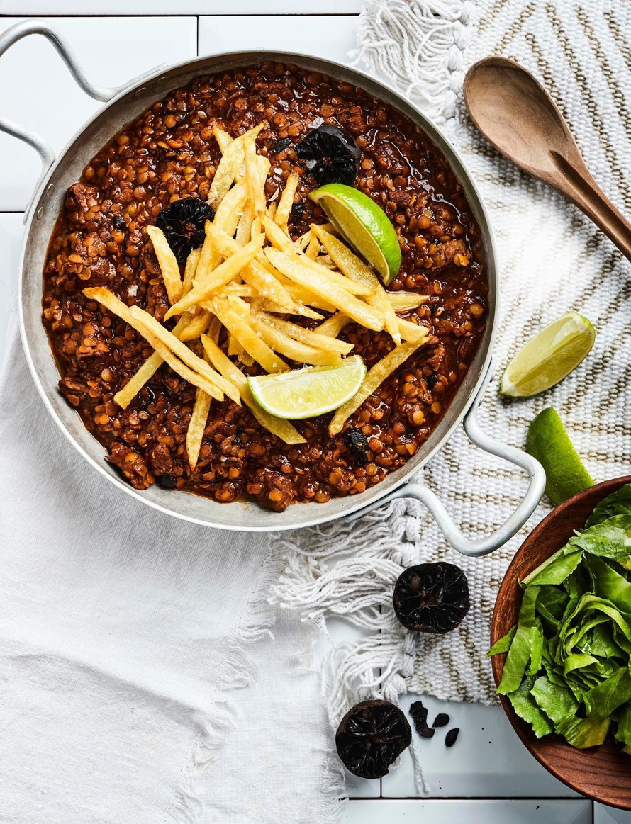 Iranilaisen lammas-linssipadan päällä komeilee keko rapeita perunoita. Usein pöydässä on myös höyrytettyä riisiä ja maustamatonta jogurttia.