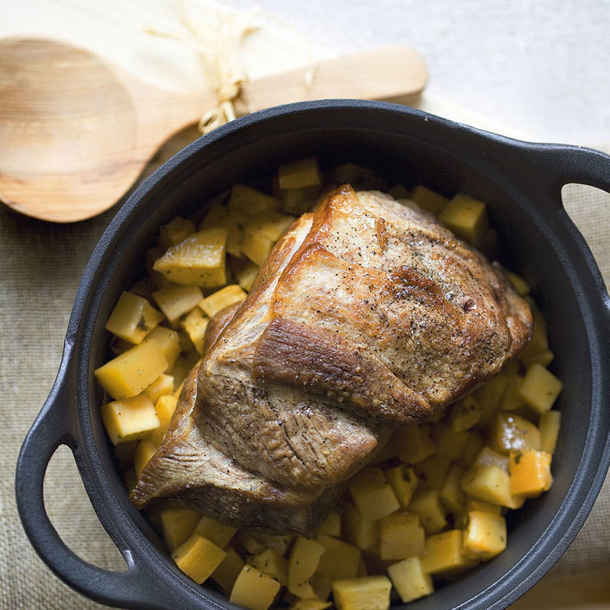 Lanttukuutiot ja possu kypsennetään meheviksi samassa astiassa.
