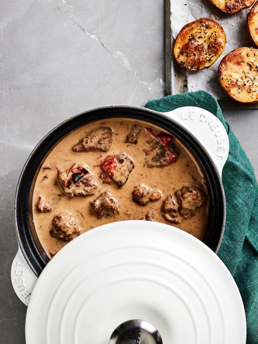 Sulatejuusto ja tuorejuusto pyöristävät lihapadan, joka saa hautua uunissa kolmekin tuntia. Paprikakuutiot tuovat pataan kaivattua särmää.