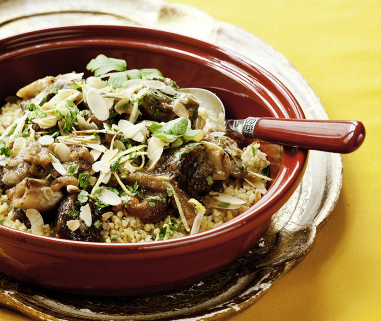 - Lisää pannuun paloitellut kuivatut aprikoosit. Hauduta vielä noin 15 minuuttia. Mausta tagine sitruunanmehulla ja -kuorella sekä silputulla tuoreyrtillä. Tarkista maku.