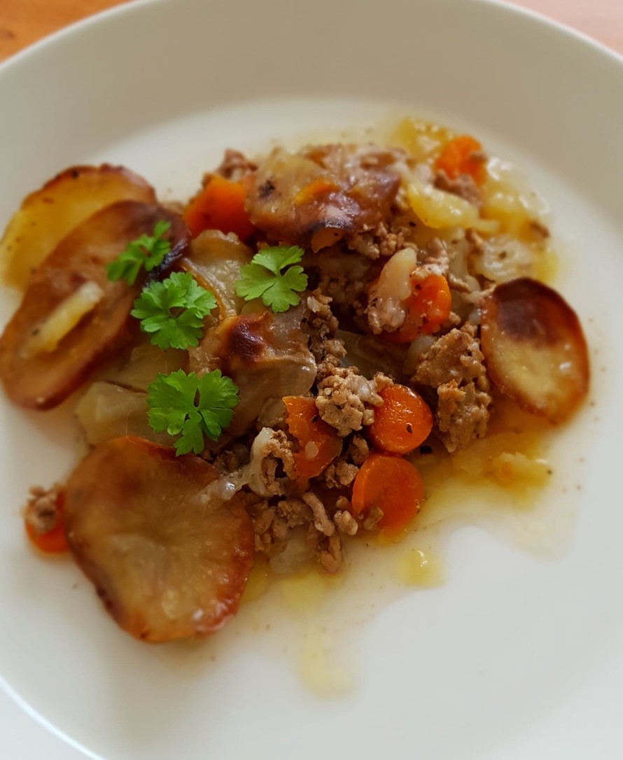 2. Lataa kaikki ainekset kerroksittain vuokaan. Aloita ja lopeta perunoilla. Mausta suolalla ja pippurilla joka kerros. Minä käytän nykyään mustapippuria, mutta äitini kyllä käytti aina maustepippuria ja heitti niitä kokonaisina perunoiden sekaan.