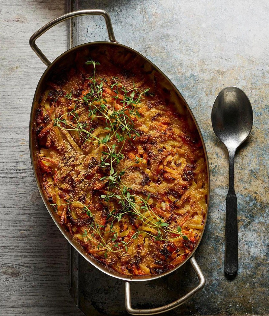 Juhlakiusauksen saa vaivattomasti pöytään, kun käyttää apuna pakastealtaan peruna-sipuli- ja juuressekoitusta. Mukaan kannattaa suikaloida lisäksi purjoa ja pinta kuorruttaa rapeaksi korppujauholla.