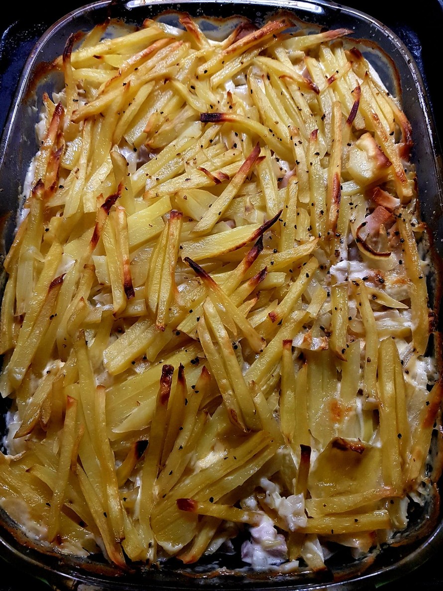 Täyteläisen kinkkukiusauksen kruunaa kuohukerma ja sehän on tosi kuin vesi! Tästäkin kiusauksesta saa tietenkin kevyemmän korvaamalla kuohukerman kevytkermalla tai kasvisrasvasekoitteella. Minulta jäi joululta kinkkua ja kuohukermaa ja tottakai tein niistä tätä nuorison toiveherkkua uudeksivuodeksi. On ihanaa omistaa mandoliini, ja nyt tein nämä perunasuikaleet sen isommalla terällä. Tuli hyvää ja rustiikkista! Tämä on helppo ja maukas uuniruoka eikä tule ruokahävikkiä!