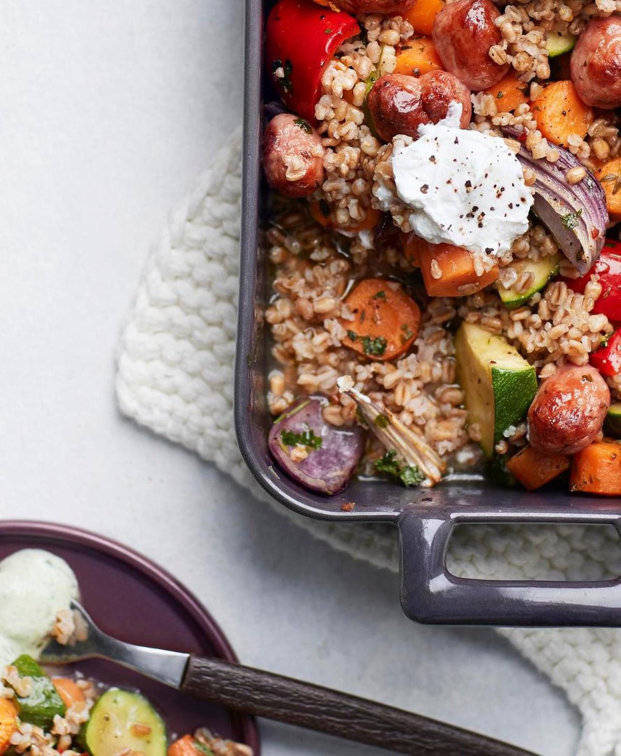 Kypsennä sillä aikaa ateriajyvät pakkauksen ohjeen mukaan. Sekoita kypsiin kasviksiin ja makkaroihin. Murenna vuohenjuusto ja pyöräytä sekin vuokaan.