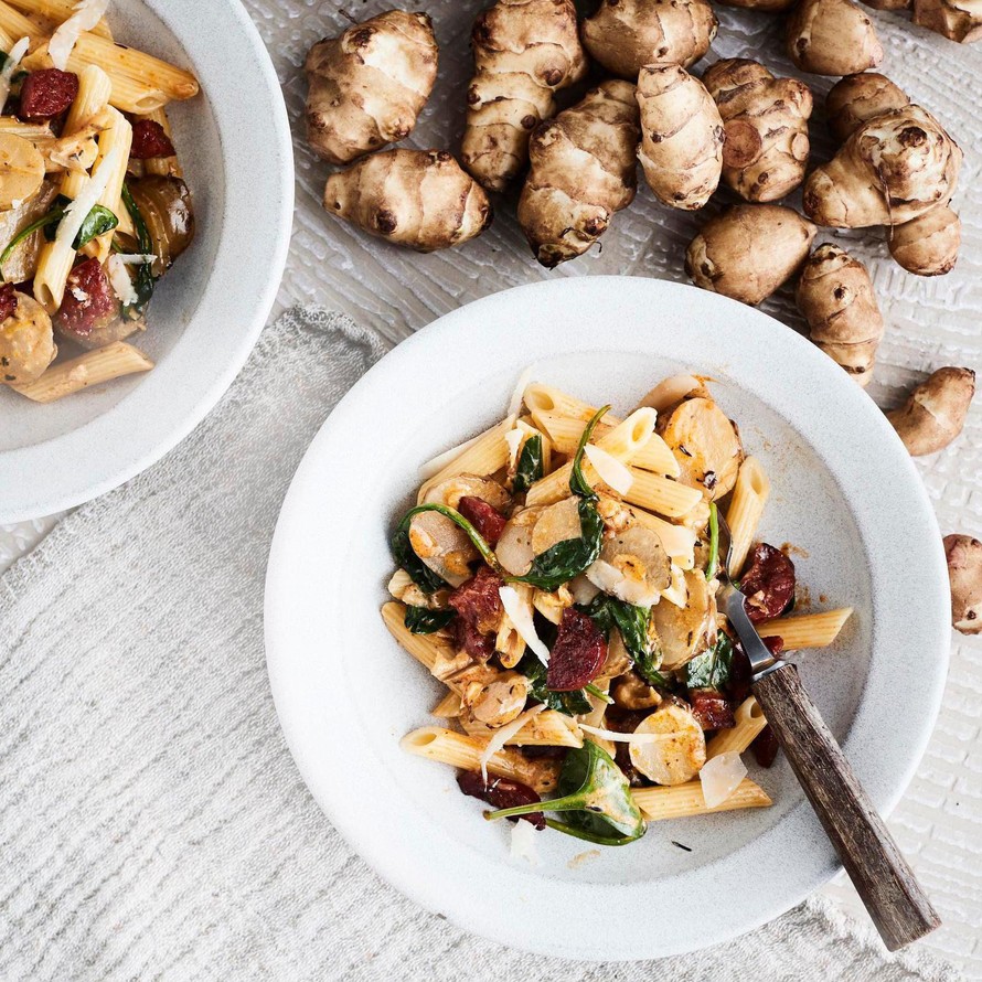 Maa-artisokka on tuttu näky keitoissa, mutta se sopii myös moniin muihin ruokiin – vaikka pastaan! Timjamin ja mausteisen chorizon kanssa maa-artisokka on todellinen yllättäjä.