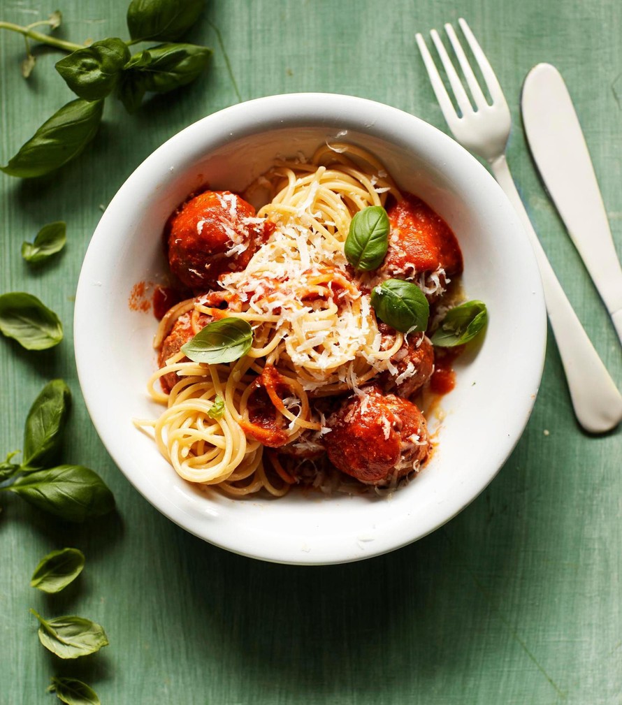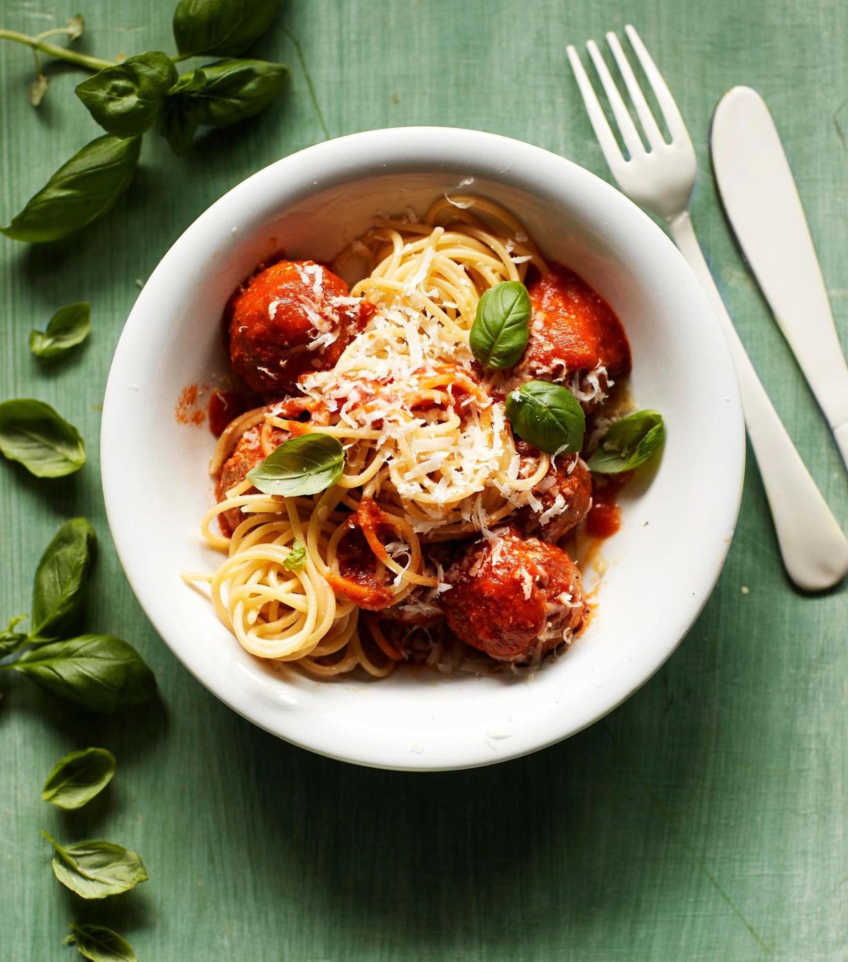 Soseuta sillä aikaa tomaattikastike sauvasekoittimella tasaiseksi. Hienonna basilika joukkoon. Nosta pullat kastikkeeseen ja anna hautua 20 minuuttia pienellä lämmöllä. Tarjoa keitetyn spagetin kanssa.