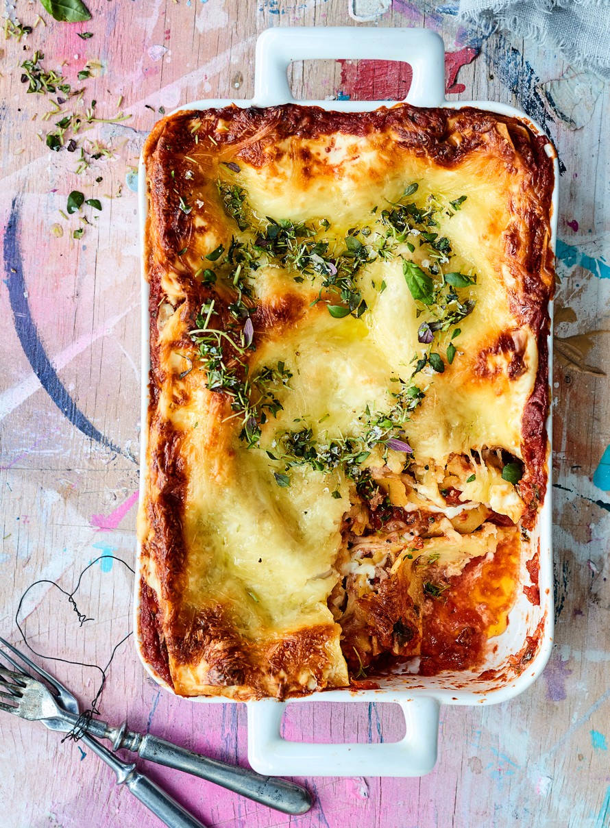 Tämä täyteläinen ja mehevä lasagne on vartissa valmis uuniin. Valkokastikkeen tilalle kerrosten väliin lusikoidaan mascarponejuustoseosta, joka säästää kastikkeen keittelyltä.