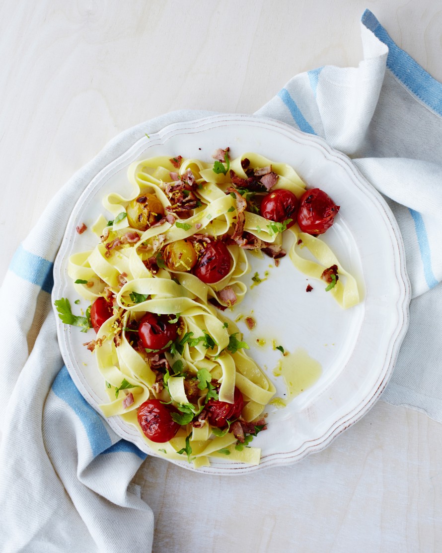 Pekoni, tomaatti ja sitruuna yhdistyvät vastustamattoman hyväksi pastaksi.