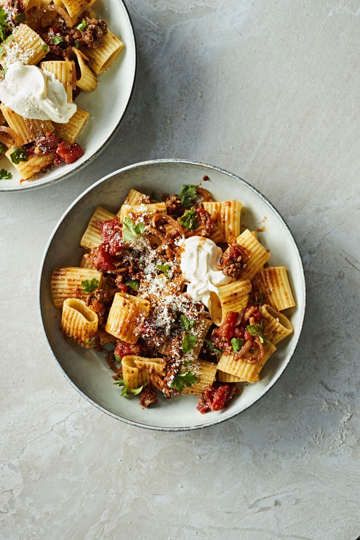 - Kaada sipuli-palsternakkaseos kastikkeen joukkoon. Hauduta kastiketta 15 minuuttia. Keitä sillä aikaa pasta.