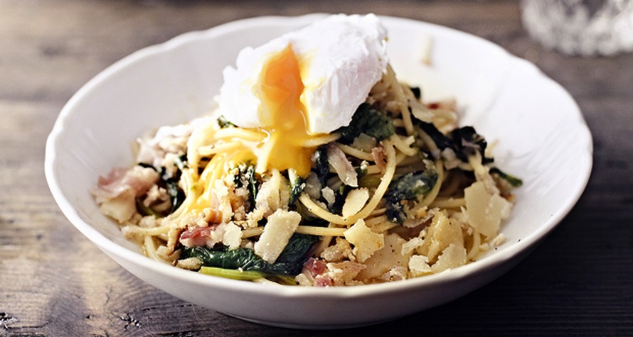 Pinaattispagetti syntyy nopeasti arki-iltana. Ja kun päälle taituroi uppomunan, annos kelpaa juhlavampaankin pöytään.