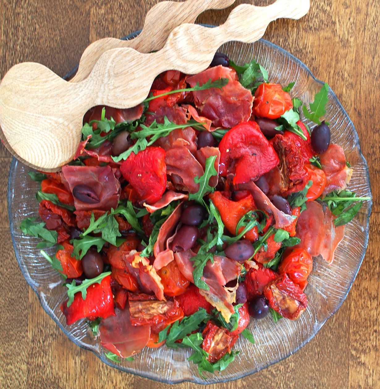 Kokoa salaatti laakealle lautaselle rucolasta, paahdetuista paprikoista ja tomaateista. Nostele päälle oliiveja ja rapeaa kinkkua. Viimeistele aurinkokuivatun tomaatin öljyllä ja mustapippurilla.
