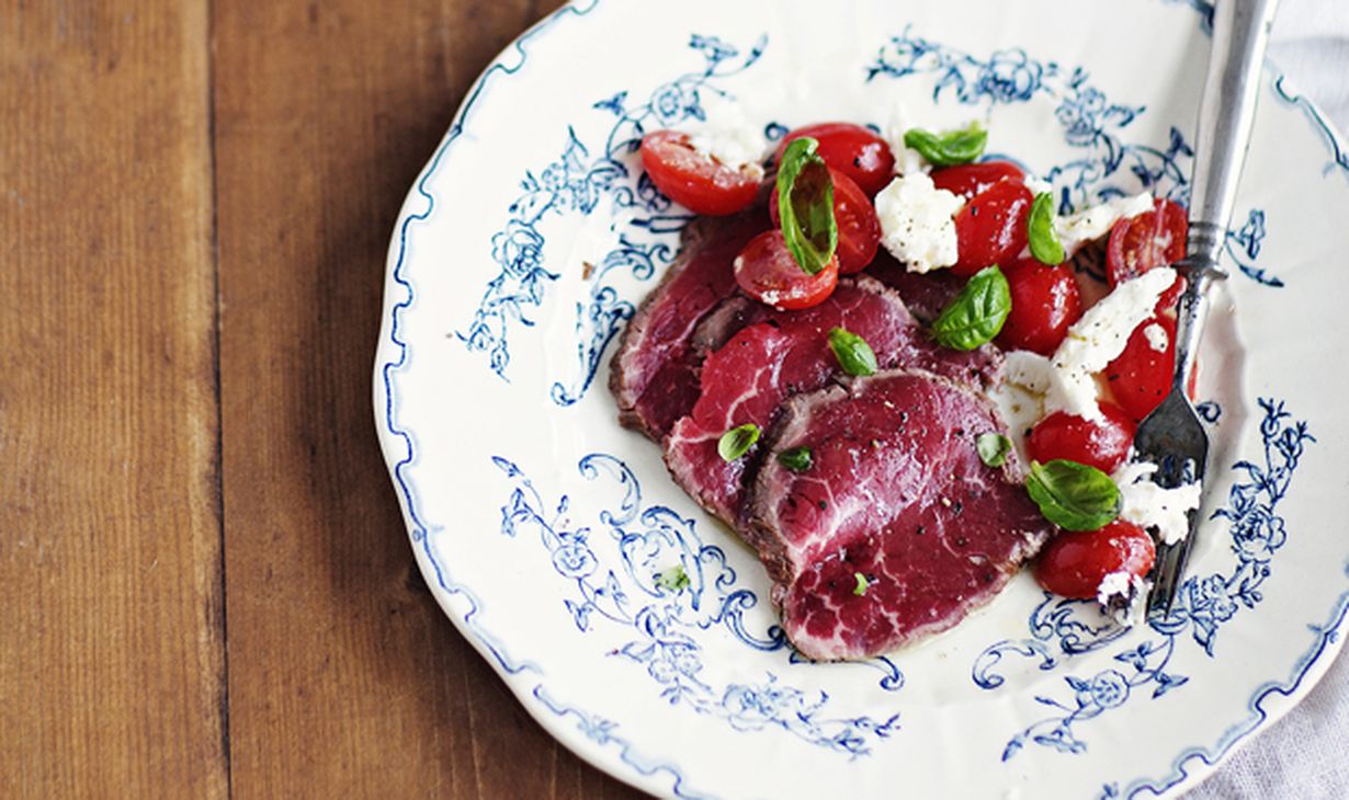 Carpaccio maistuu ihanalta tomaatti-mozzarellasalaatin kanssa.