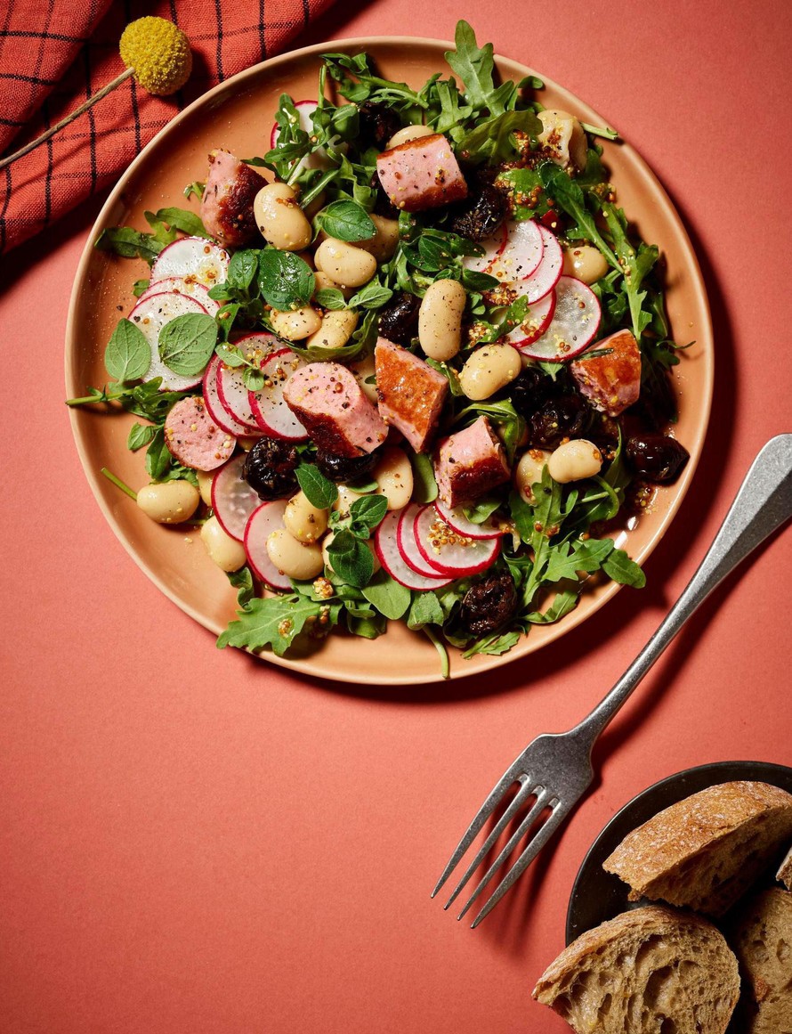 Paista makkara välillä salaattiin. Valkoiset pavut ja sinappinen kastike tekevät salaatista erityisen mehevän ja täyttävän.