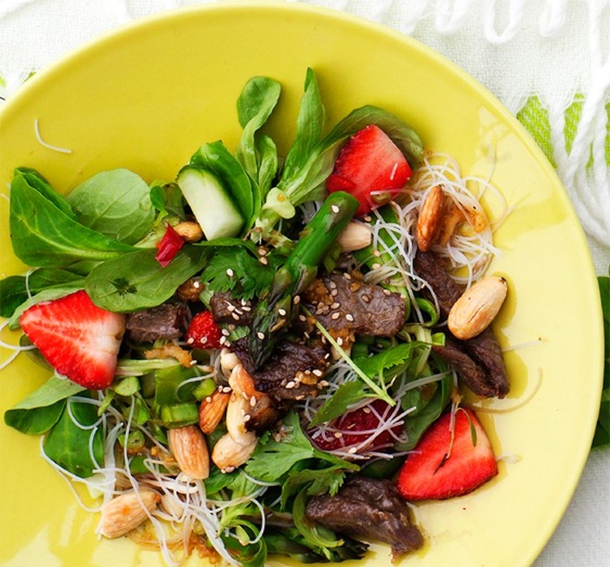 Itämainen nuudelisalaatti saa makua mansikoista ja vihreästä parsasta.