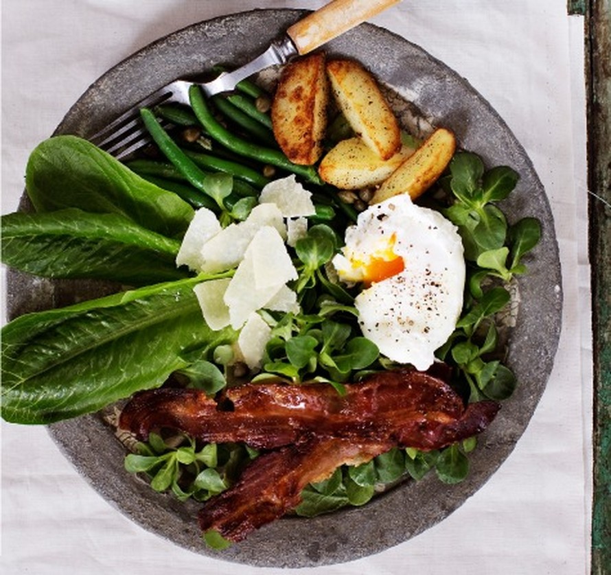 - Tee kastike. Raasta valkosipulinkynsi. Sekoita kastikkeen ainekset yhteen. Mausta suolalla ja pippurilla. Revi salaatinlehdet tarjoilukulhoon. Lisää kastike ja sekoita. Nosta pavut, perunat ja pekoni salaattipedille. Ripottele päälle kaprikset ja juustolastut. Nosta uppomunat päällimmäiseksi ja leikkaa niihin viilto, jotta keltuainen valuu salaatille kastikkeeksi.