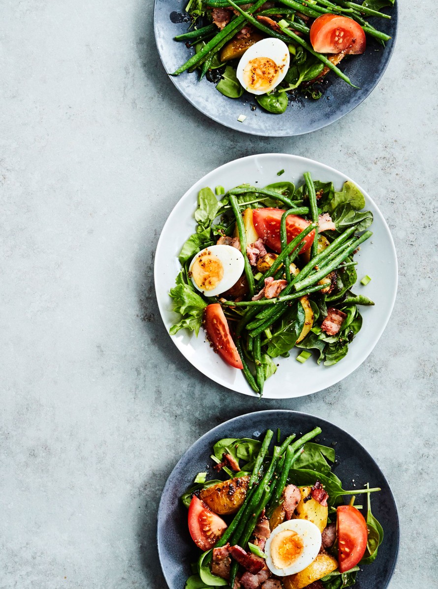 Pekonia, pottuja, kananmunia, pekonin rasvassa pyöräytettyjä papuja... Sinappivinegretillä kruunattu maalaissalaatti vie taatusti nälän mennessään.