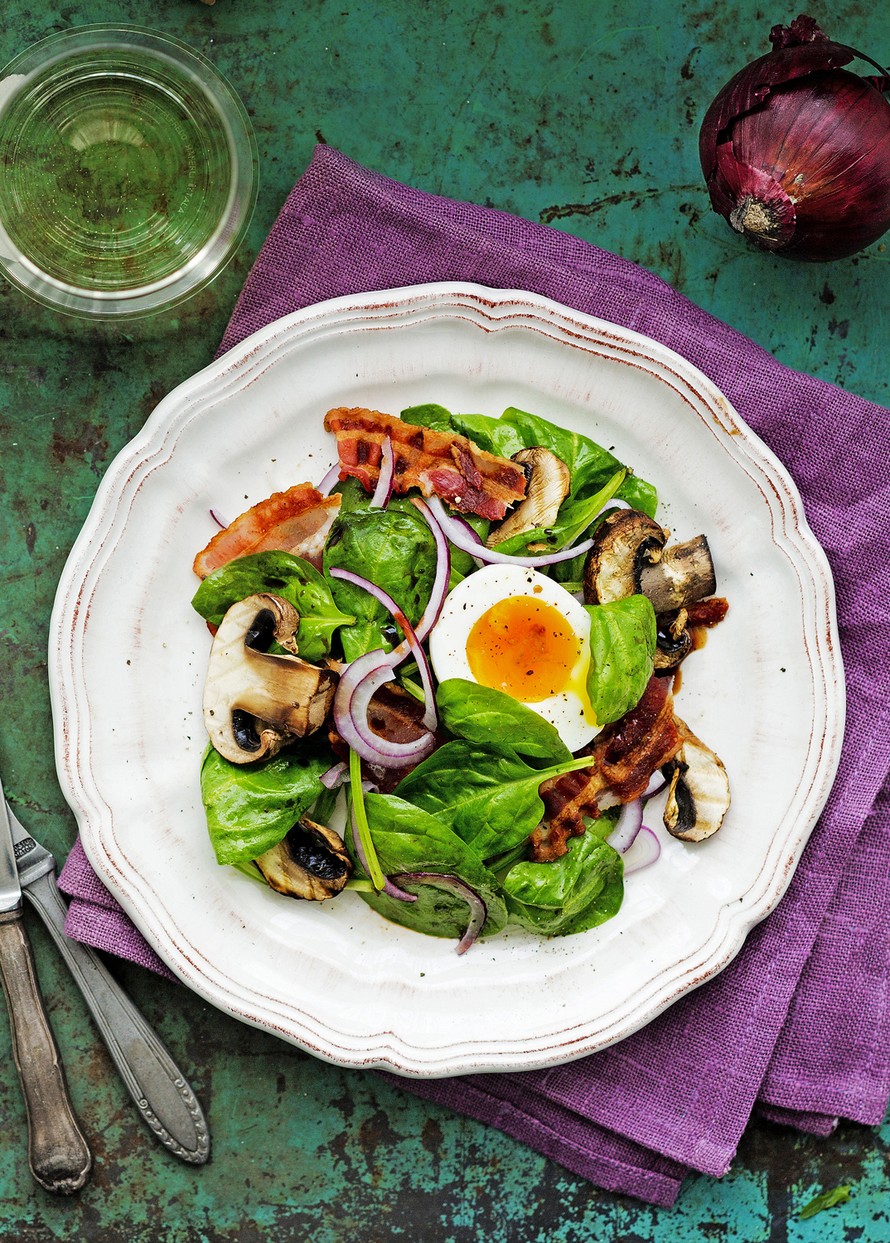 - Kokoa annokset. Kuori ja lohko kananmunat. Asettele pinaatinlehdet, sienet ja sipulit lautasille. Nosta pekoni ja kananmunalohkot päälle. Mausta suolalla ja pippurilla. Valuta kastike pinnalle.