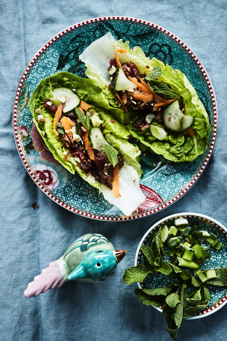 - Kokoa salaatinlehdelle bulgogia, kevätsipulia, yrttejä, porkkanaa, seesamikurkkuja sekä dippiä. Lisää halutessasi majoneesia.