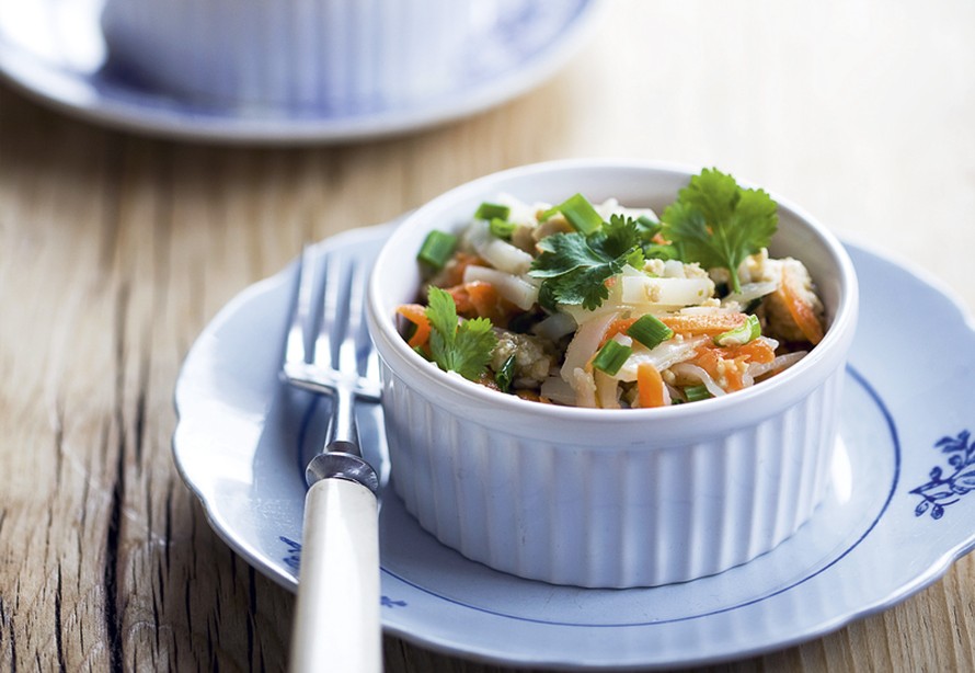 - Keitä vettä kattilassa tai vedenkeittimessä. Pätki nuudelit tilavaan kulhoon ja kaada kiehuva vesi päälle. Jätä nuudelit turpoamaan pakkauksen ilmoittamaksi ajaksi. Kun nuudelit ovat pehmenneet, valuta ne vedestä ja huuhdo lävikössä kylmän, juoksevan veden alla.