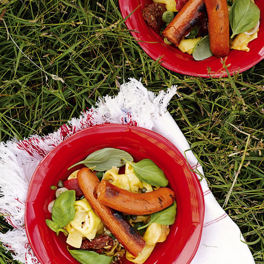- Paista makkarat ja tarjoile ne pastasalaatin kanssa. Salaatin voi tarjoilla joko haaleana tai kylmänä. Voit halutessasi viipaloida makkarat.