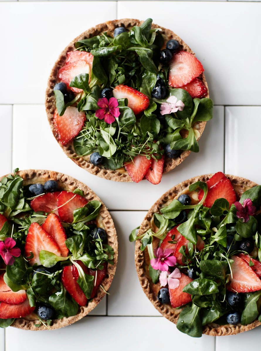 - Viipaloi mansikat. Ripottele vuonankaali, versot ja marjat piiraiden päälle. Koristele esimerkiksi syötävillä kukilla. Tarjoa heti.