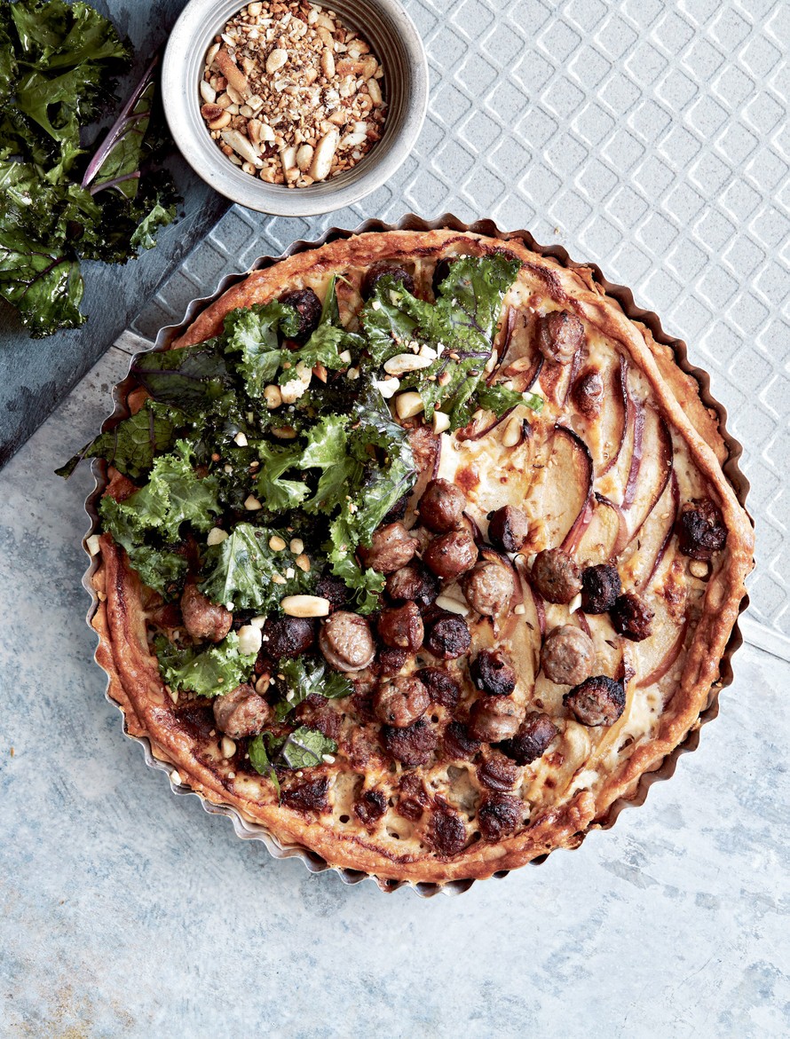 - Laita uuni kuumenemaan 175 asteeseen. Painele tai kauli taikina jauhojen avulla piirakkavuoan (Ø n. 25 cm) pohjalle ja reunoille. Lado omenaviipaleet ja puolet makkaroista pohjalle. Lusikoi mascarponejogurttiseos päälle. Lisää loput makkarat pinnalle. Kypsennä uunissa noin 40 minuuttia tai kunnes piirakka on kypsä. Tee sillä aikaa dukkah (ks. ohje).