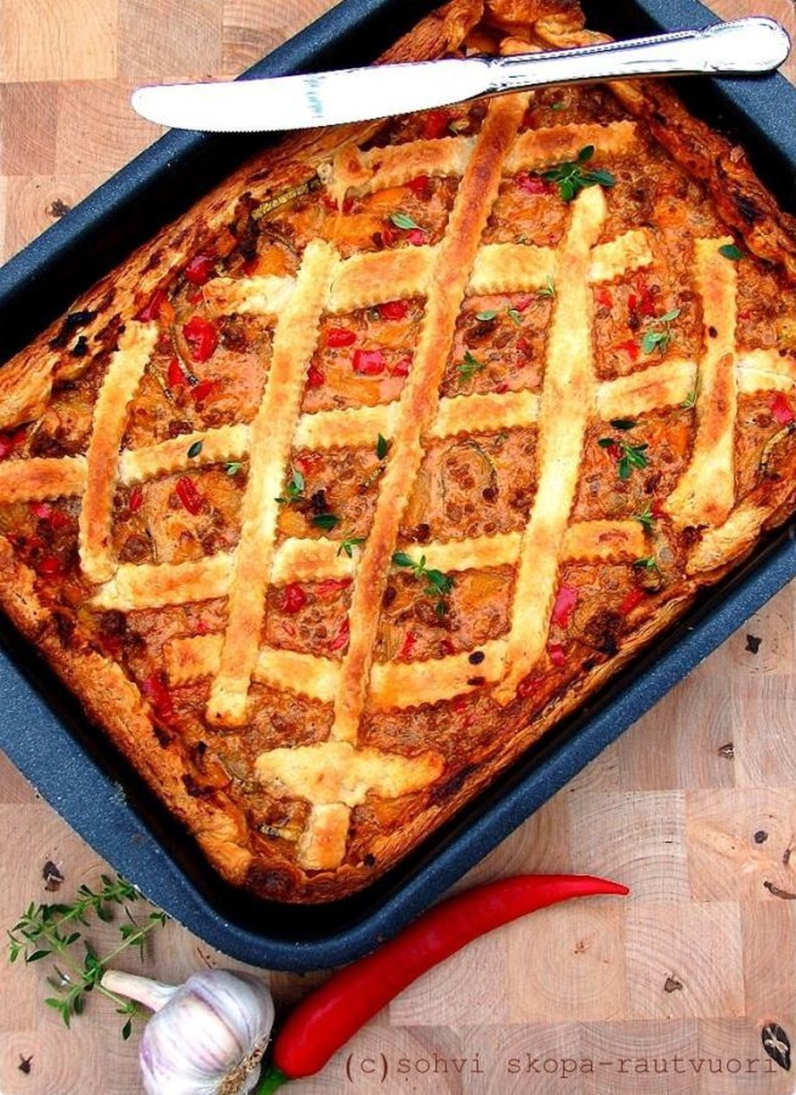 Tämä mehevän tulinen piirakka lämmittää kylmiä iltoja. Jos et pidä tulisuudesta jätä chilit pois. Täyte sopii myös nachojen kanssa naposteltavaksi tai tacojen täytteeksi.
