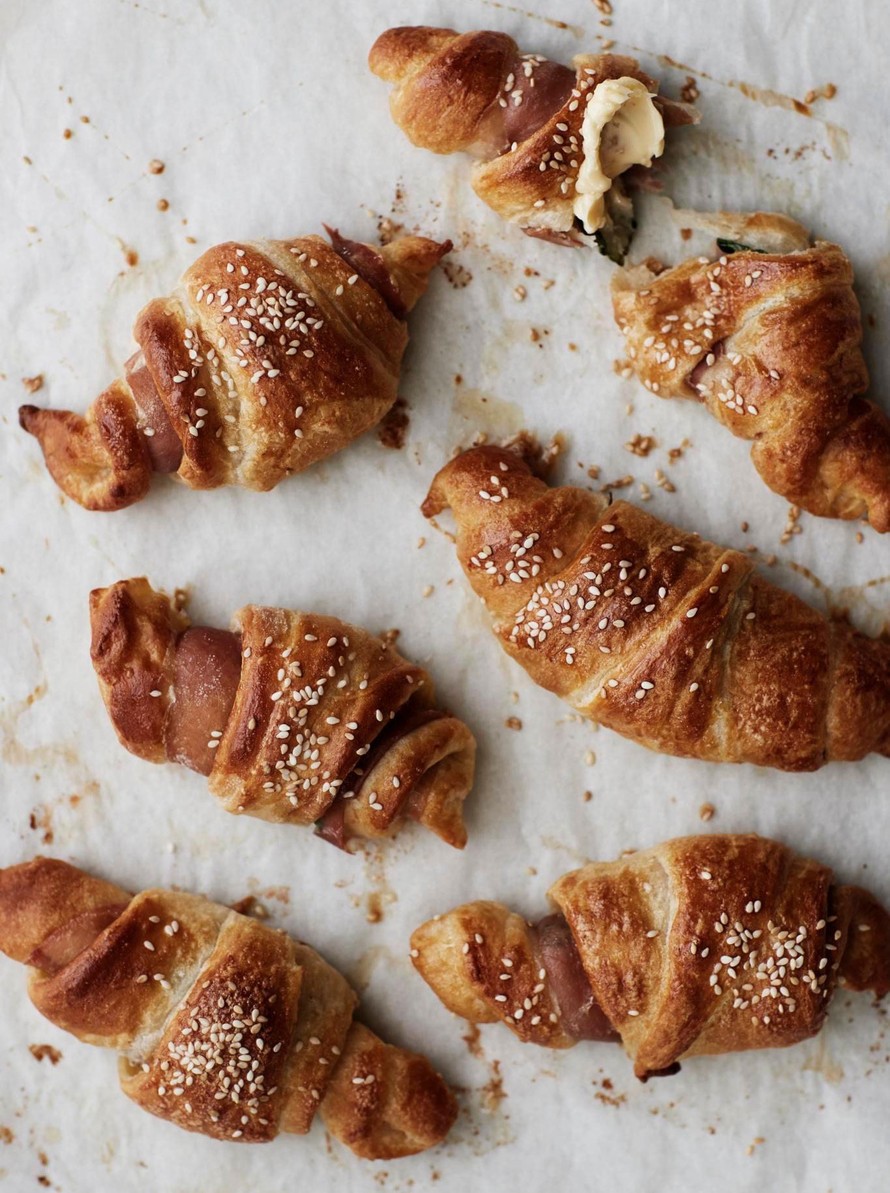 Vapise, valkosipulipatonki! Ilmakuivatulla kinkulla täytetyt valkosipuli-voisarvet ovat niin hyviä, että ne viedään suoraan pelliltä. Onneksi toinen satsi valmistuu nopeasti ja helposti, sillä croissantit tehdään valmistaikinasta.