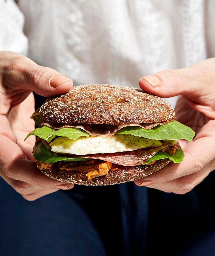 Voitele ruisleivät tomaattihummuksella ja täytä halloumilla ja salaatilla ja halutessasi myös meetvurstilla.