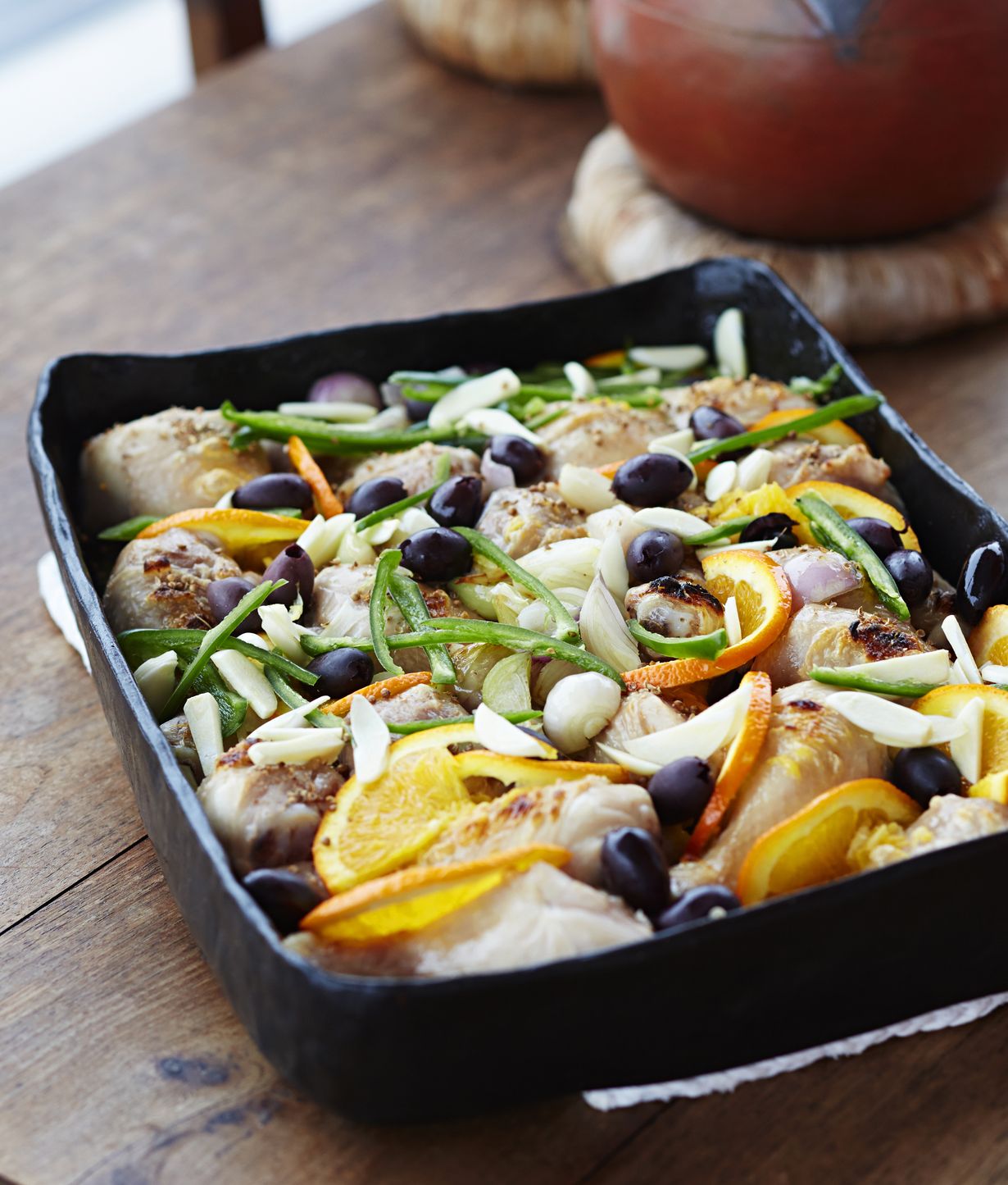 - Ota broilerit uunista. Lisää joukkoon appelsiiniviipaleet, chilit, sipulit ja oliivit. Sekoita appelsiinimehu ja oliiviöljy ja kaada uunivuokaan. Jatka kypsennystä 200-asteisessa uunissa noin 35 minuuttia.