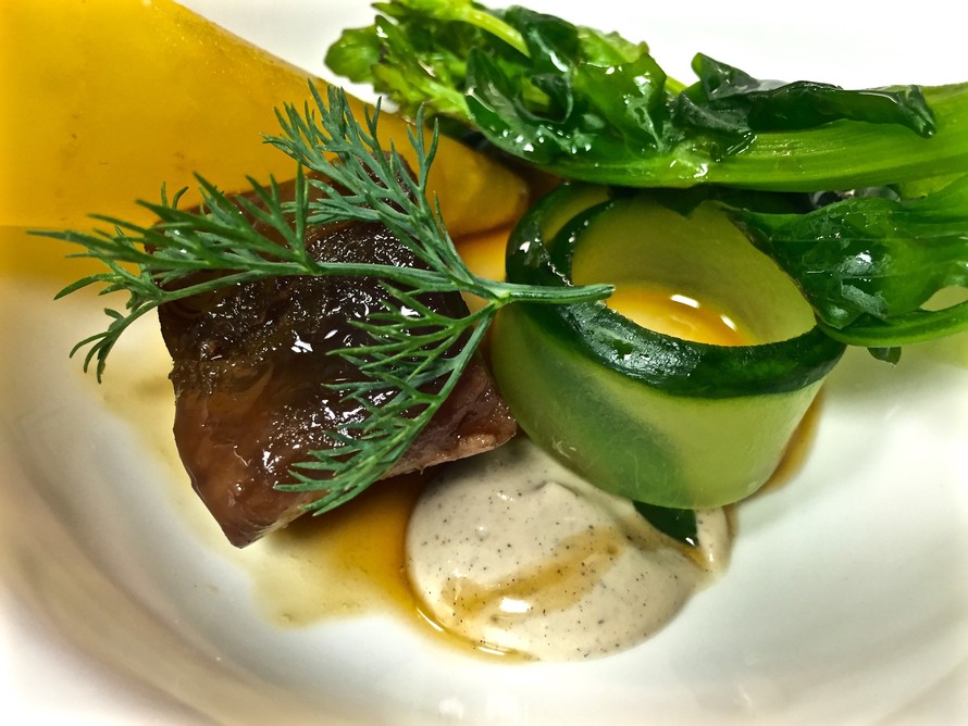 Leikkaa keltajuurista ohuita lastuja mandoliinilla ja pikkelöi ne. Leikkaa myös kurkusta ohutta lastua ja paineista ne vacumilla pikkeliliemen kanssa.