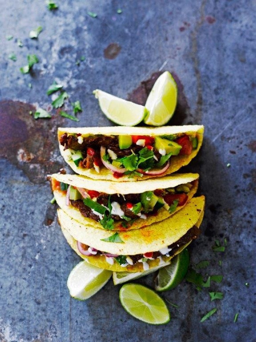 Ota lihat marinadista ja paista viipaleita noin puoli minuuttia molemminpuolin todella kuumalla pannulla. Tarjoa kuumana tacojen täytteenä. Jokainen ruokailija saa täyttää tacon makunsa mukaisesti.