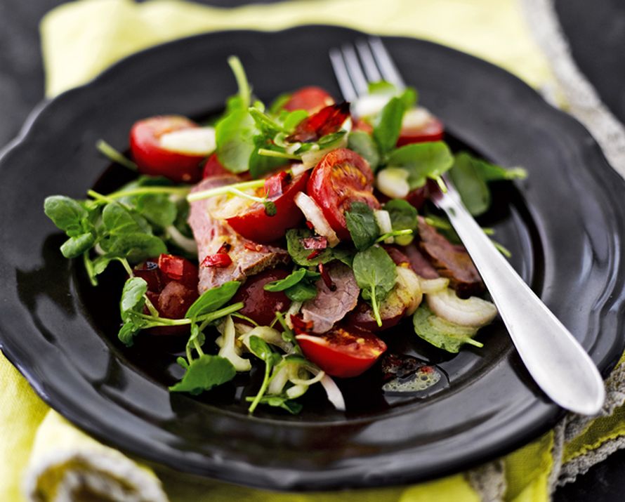 - Valmista salaatti. Halkaise tomaatit. Halkaise sipulit ja leikkaa ne ohuiksi viipaleiksi. Laita kasvikset kulhoon ja revi vesikrassi joukkoon. Sekoita loppu kastike joukkoon. Leikkaa liha ohuiksi viipaleiksi.