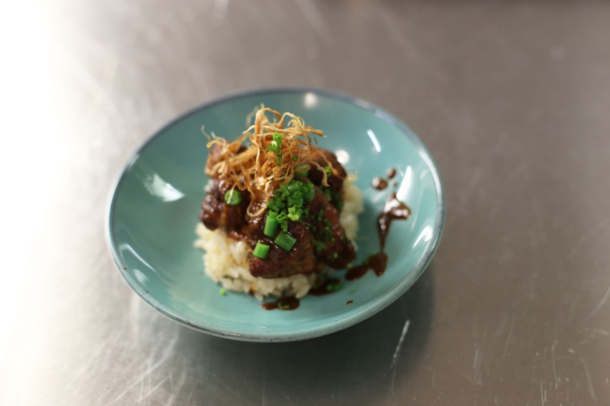 - Kasaa riisi lautaselle, asettele possu äälle. Viimeistele hienonnetulla ruohosipulilla, keitetyillä pavuilla ja friteeratulla mustajuurella. Kaada päälle kastiketta.