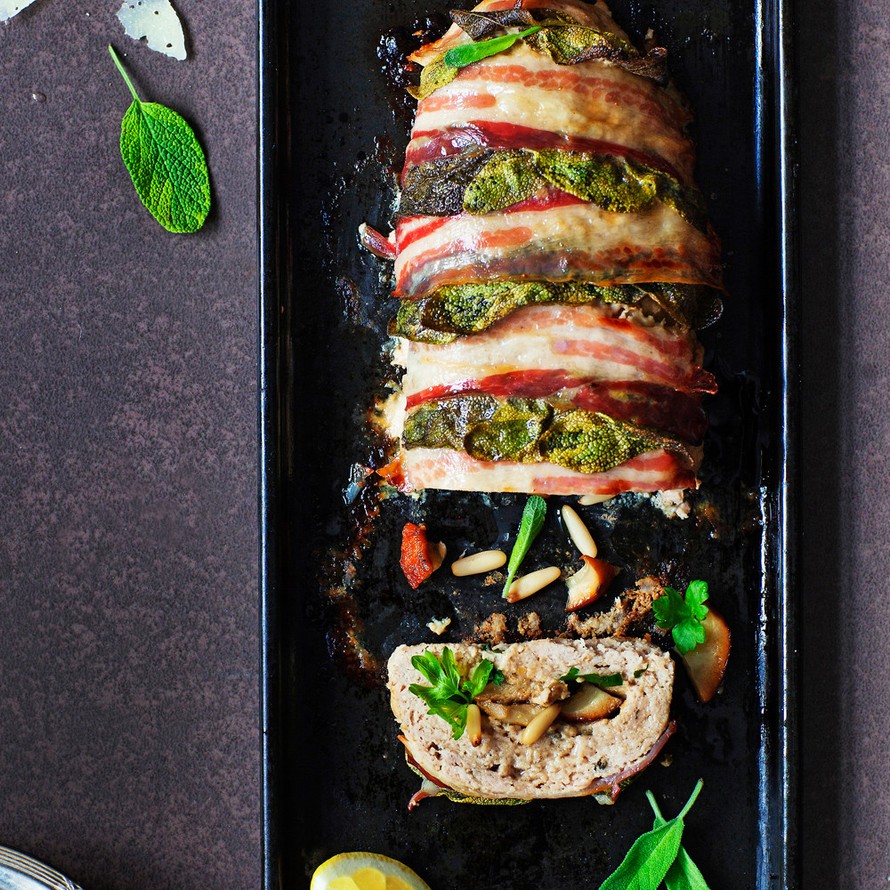 - Aseta pekoniviipaleet ja salvianlehdet lomittain murekkeen päälle. Hiero öljyä pintaan. Paista 30–40 minuuttia.