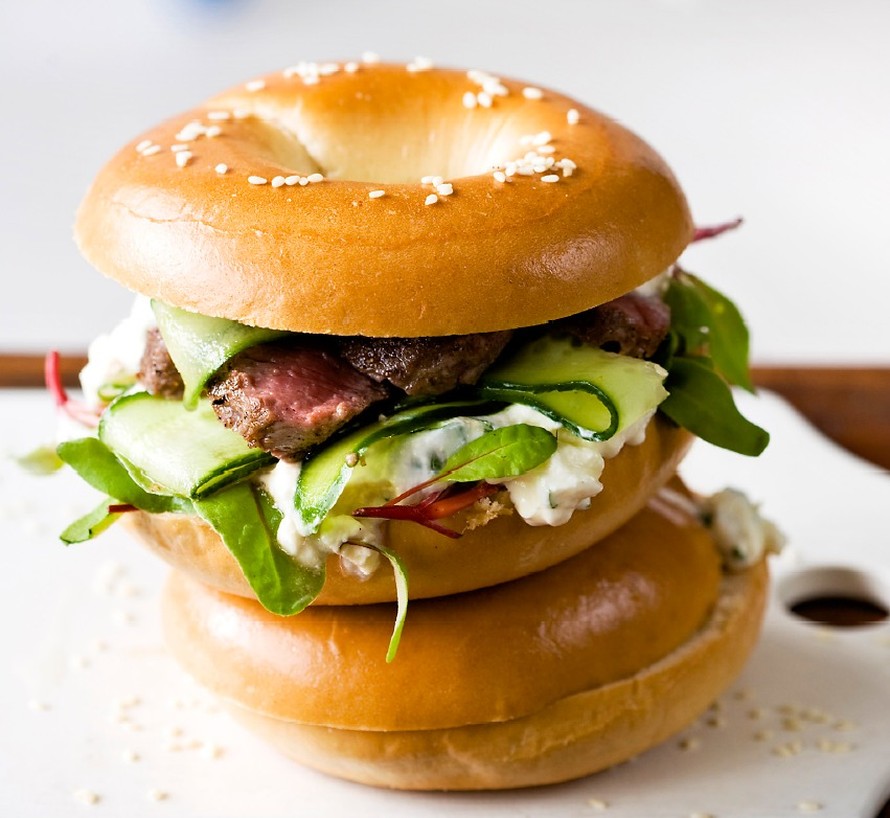 - Halkaise bagelit. Voitele puolikkaat tuorejuustolla ja täytä viinisuolaheinällä, jogurttikastikkeella, sipuli-, kurkku- ja lihasiivuilla. Mausta ripauksella suolaa ja rouhittua mustapippuria ja nauti heti.