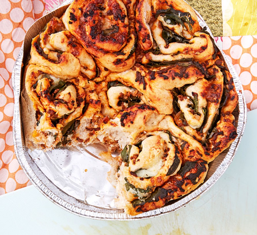 - Kuumenna uuni 225 asteiseksi. Kauli taikina levyksi ja levitä päälle jauhelihatäyte, juustoraaste ja tuore pinaatti.