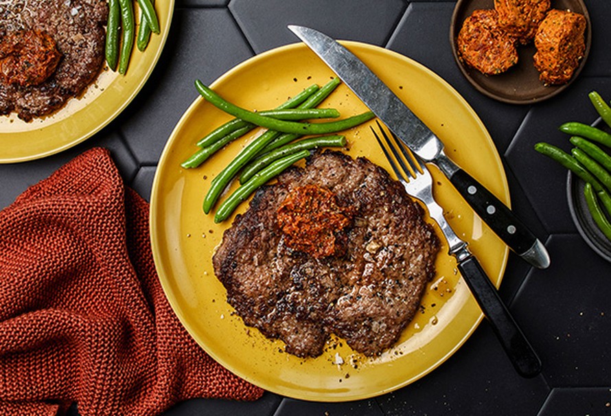 Kuumenna isolla pannulla ruokalusikallinen tomaattien öljyä. Ota jäinen pihvi pois kääreistään ja nosta pannulle. Paista noin minuutti tai kunnes neste nousee pihvin pintaan. Käännä ja paista toinen puoli. Mausta suolalla ja pippurilla. Siirrä pihvi lautaselle ja peitä foliolla. Paista loput pihvit samoin. Leikkaa maustevoista voinapit pihvien päälle. Säilytä loppu maustevoi pakastimessa ja käytä liha- tai kasvisruokien lisukkeena.