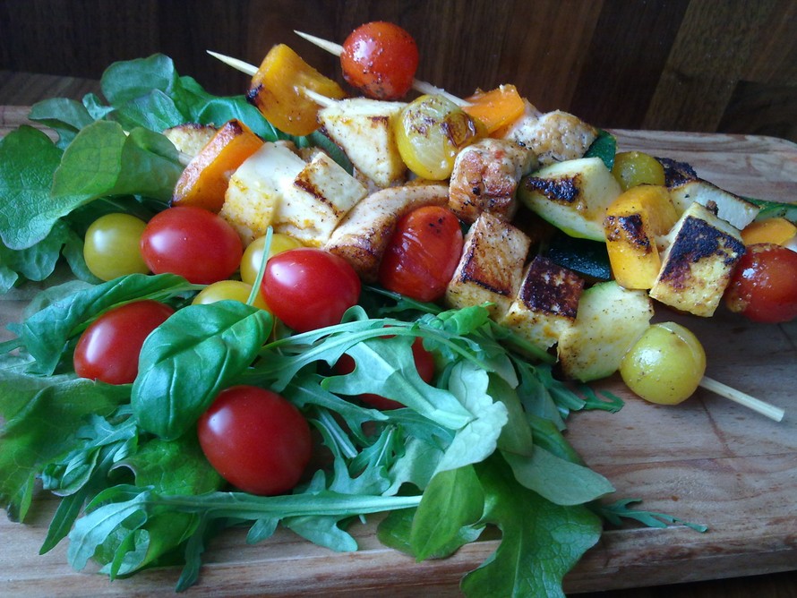 Grillivartaisiin pujotetaan vihannesten lisäksi juustoa ja broileria.