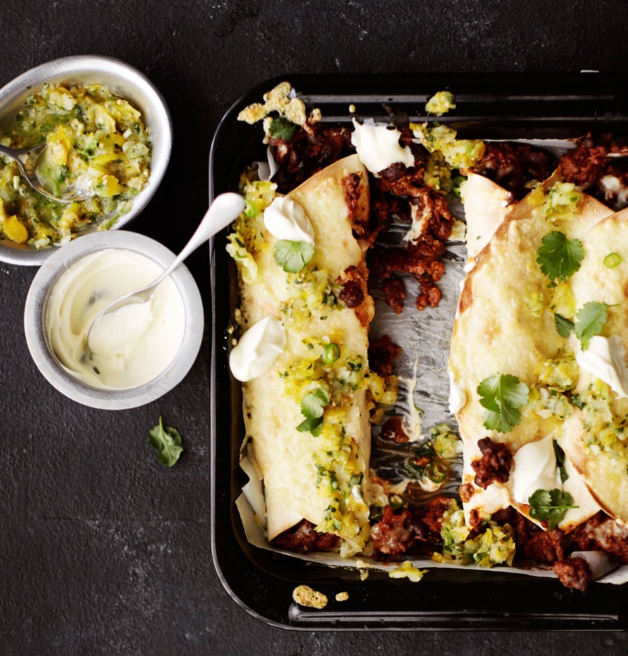 Mausteisiin jauhelihaburritoihin tulee himo! Kirpeää korianterisalsaa kannattaa lisätä isolla lusikalla.