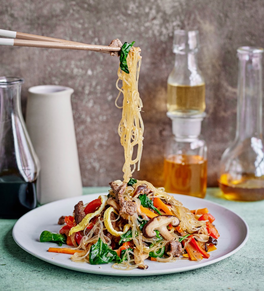 Korealaisiin japchae-nuudeleihin leikataan ohuita naudanfileesiivuja, jotka marinoidaan aasialaisissa mausteissa.