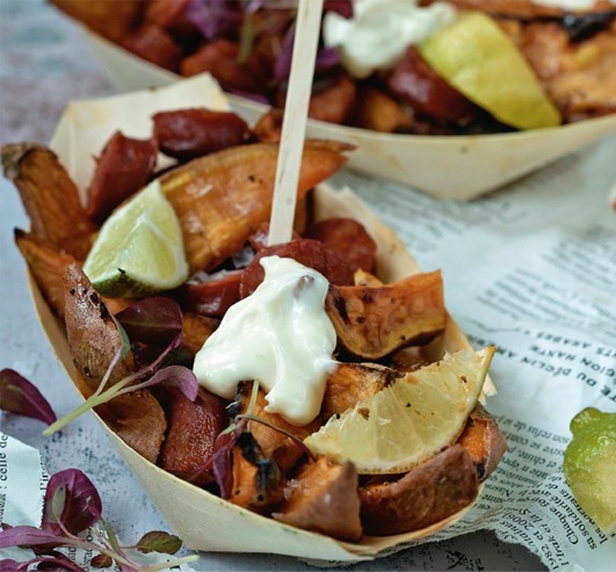 Nyt modernisoidaan makkaraperunat! Makean pehmeät bataattiveneet saavat potkua tulisesta chorizo-makkarasta. Astetta terveellisempi versio tutusta grillherkusta viimeistellään limemajoneesilla. Ja mikä parasta: koko ruoka valmistuu kätevästi yhdellä pellillä.