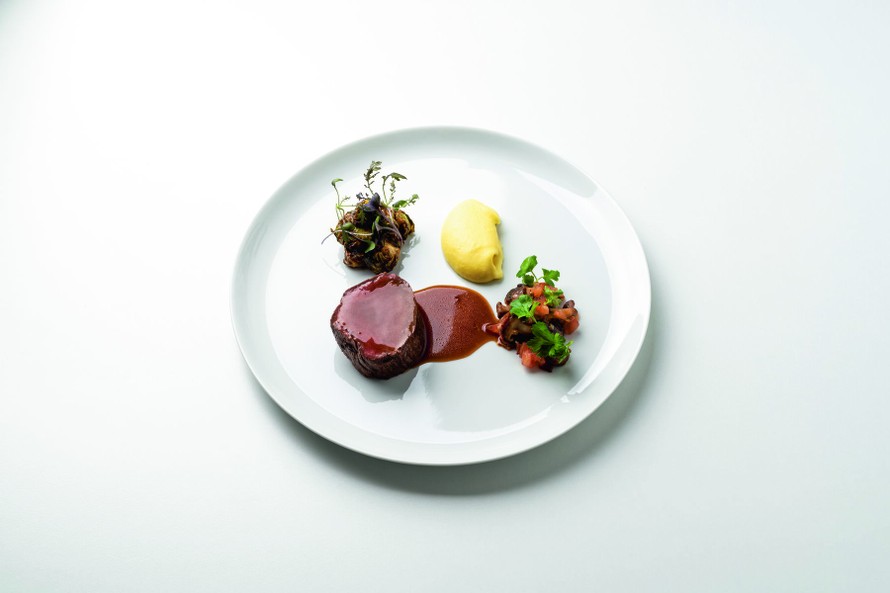 Tähtikokki Petteri Luodon suunnittelema annos on täynnä makuelämyksiä. Kuva Santeri Stenvall, lautanen E. Ahlström.
