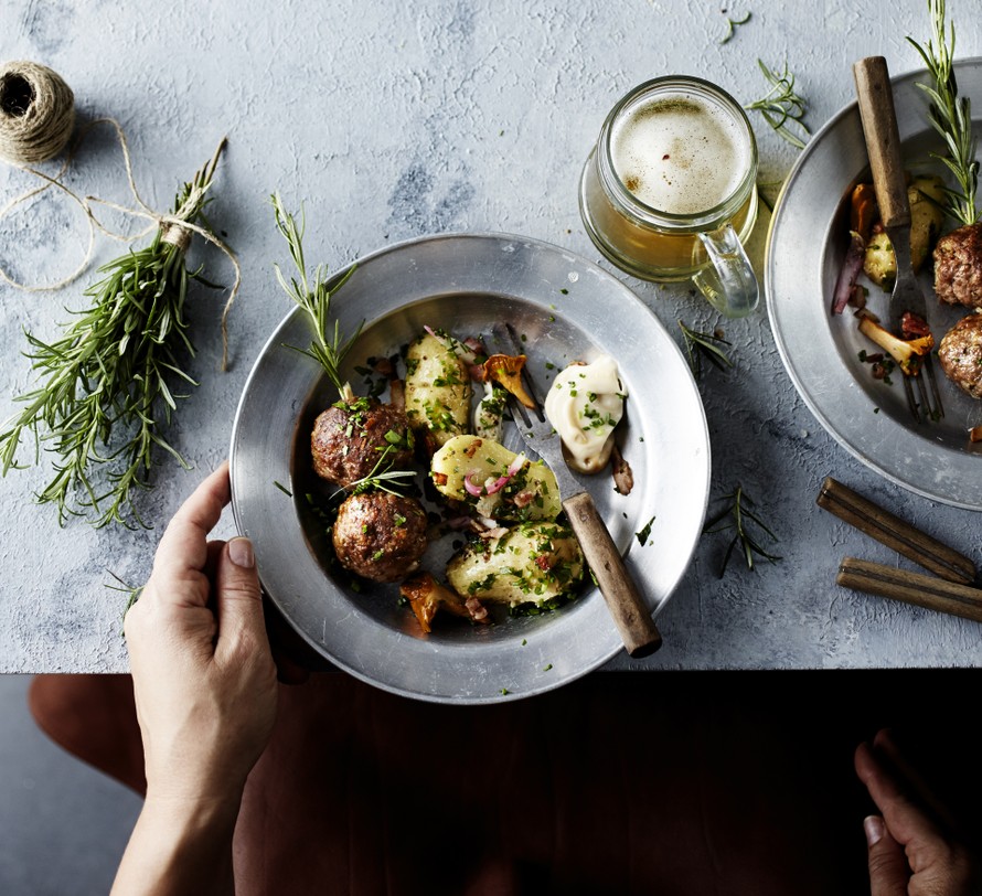 Syksyisen napostelumenun voi muodostaa tarjoamalla lihapullien lisäksi perunasalaattia ja paistettuja sieniä.
